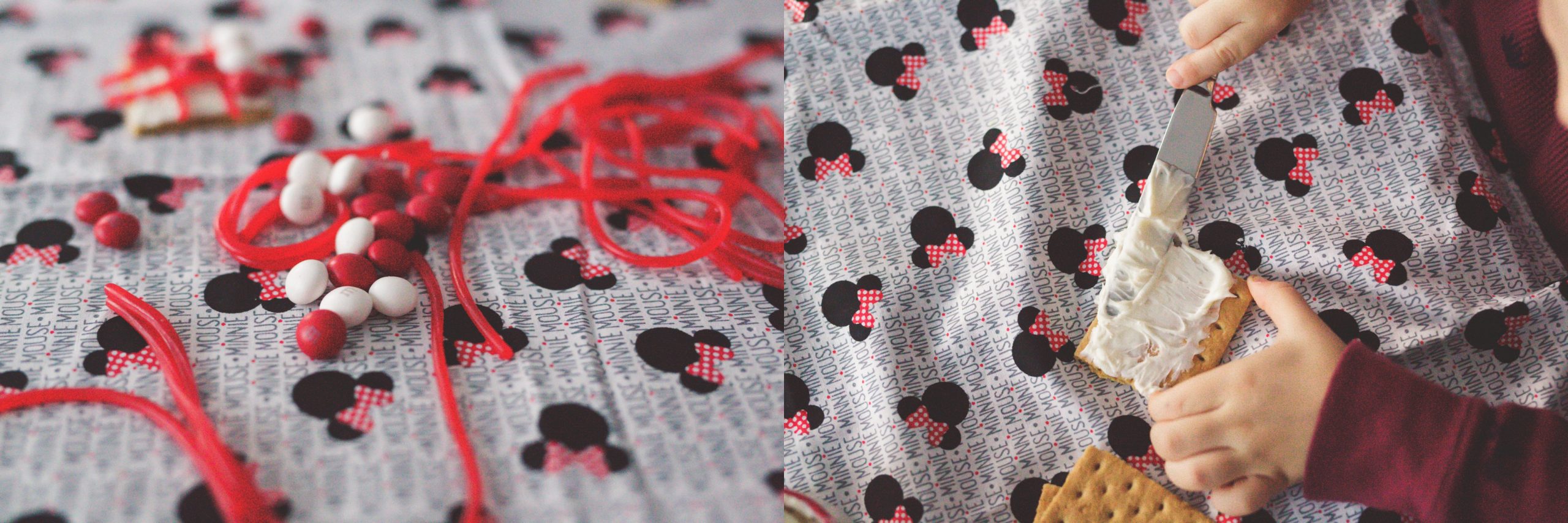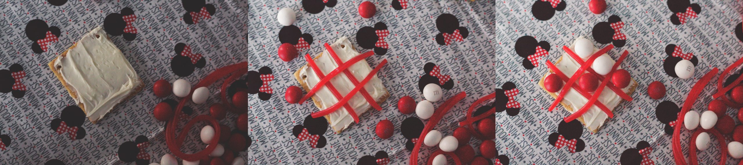 With that thought in mind, Mickey and Minnie Inspired Tic-Tac-Toe was created! Mr. D. was the spear-head behind this project, so sit back and take a look at this simple winter (and Valentine’s day!) food project! The best part? If you win, you get to eat the whole game board! Let’s take a look at our creation.