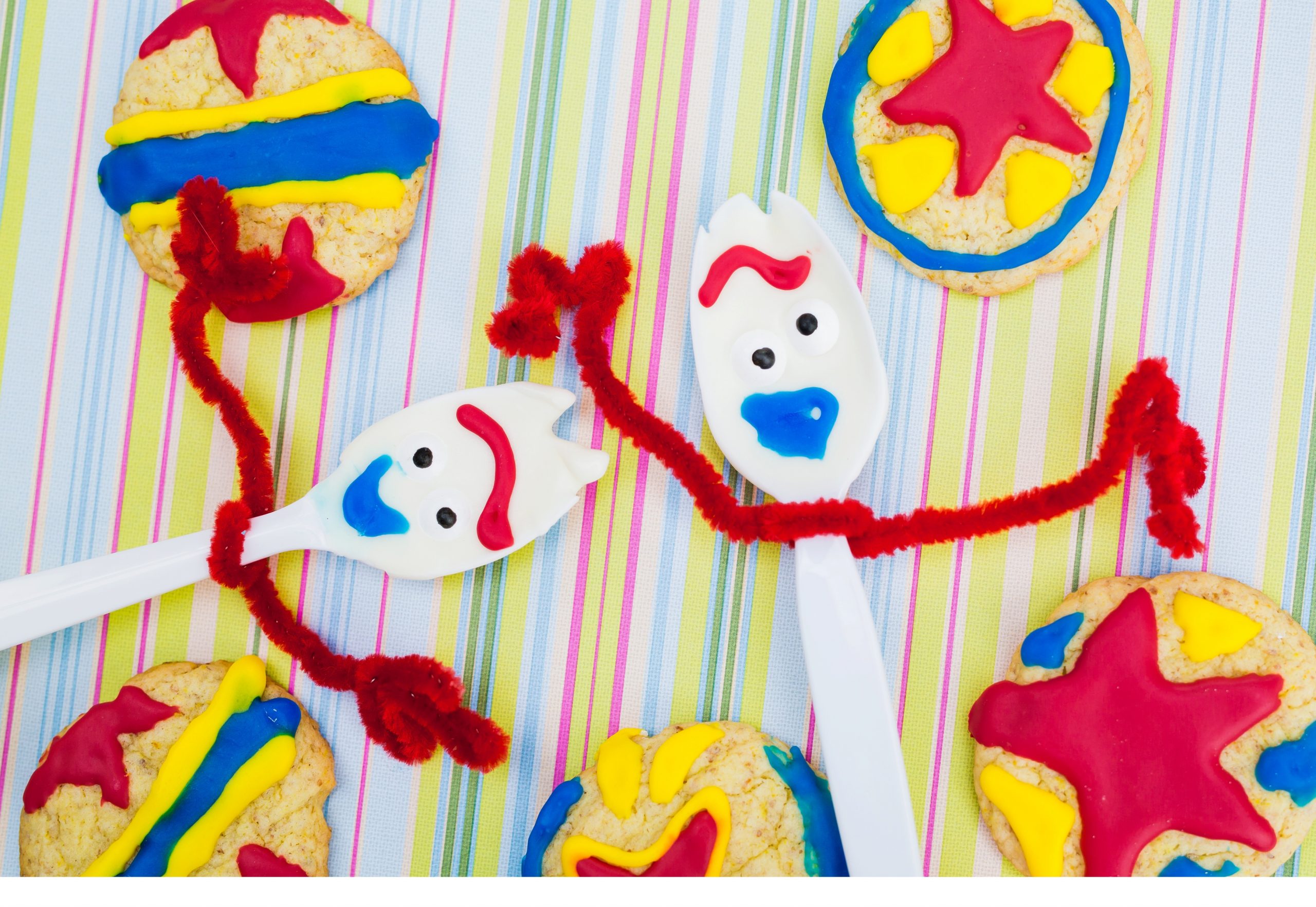 Don’t touch Forky’s mouth too soon. Odds are it’s not dry yet. The blue and red icings seem to take a lot longer than the white chocolate to dry.