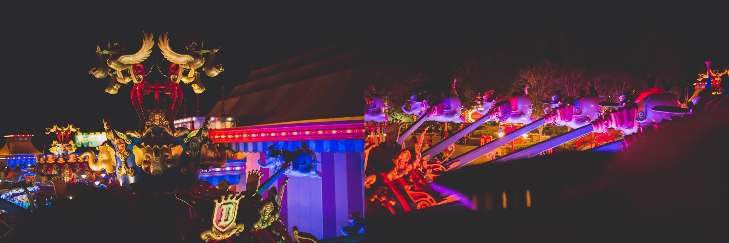 At different intervals, specifically, at 7pm (when the party official started), 9 pm and 10pm hit, we noticed the crowds seemed to thin. At 7pm, the trick-or-treating started and guests lined up for those hot spots as they opened. The lines for trick-or-treating seemed long at that time (although the were definitely moving), so we decided to hop on some rides. Dumbo had a five-minute wait, which in reality ended up being a two-minute wait.