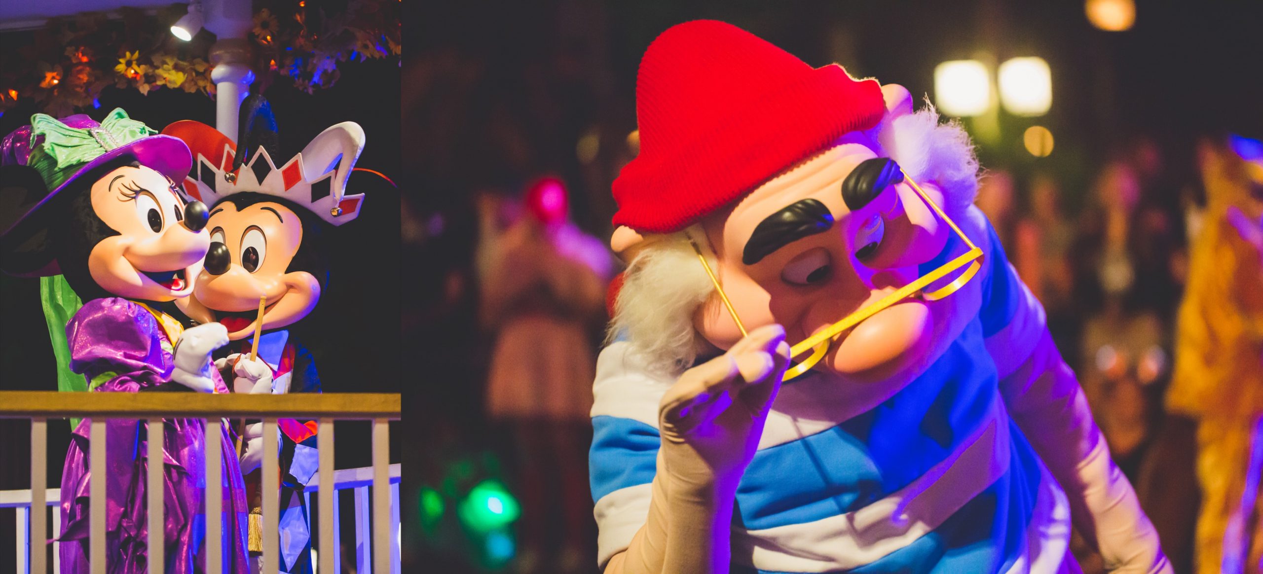 Being able to see Mickey and Minnie in their Halloween costumes is cool, especially if you are a big fan of getting character pictures. On top of the regular gang being all decked out for Halloween, rare characters also make appearances for a meet-and-greet. If you have a character you are trying to meet, it is not a bad plan to get in line early. There are some characters, like the Seven Drawfs, who are extremely popular. With two littles already at their normal ‘bedtime’ at MNSSHP start, standing in line for a few hours sounded like a recipe for disaster. We did, however, met Tarzan and Jane right when the clock struck 7pm!