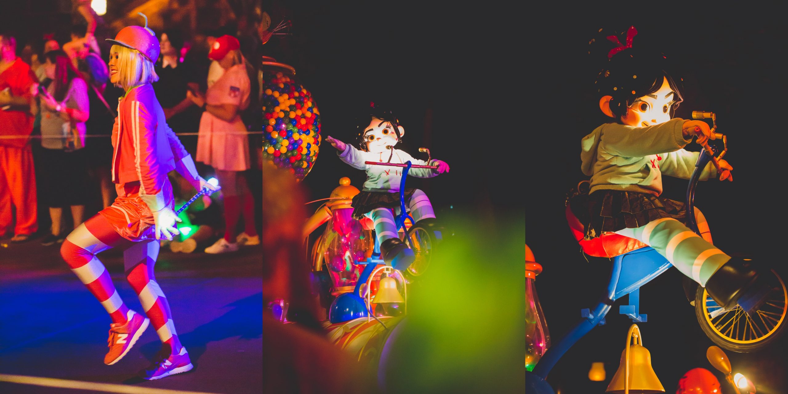My favorite parts were the ‘gravediggers’ and 99 (ish) happy haunts from the Haunted Mansion. It was as though a real-life version of the Haunted Mansion ride was dancing down the streets of the Magic Kingdom. We even saw some of our doppelgängers in the parade: Vanellope and Ralph!