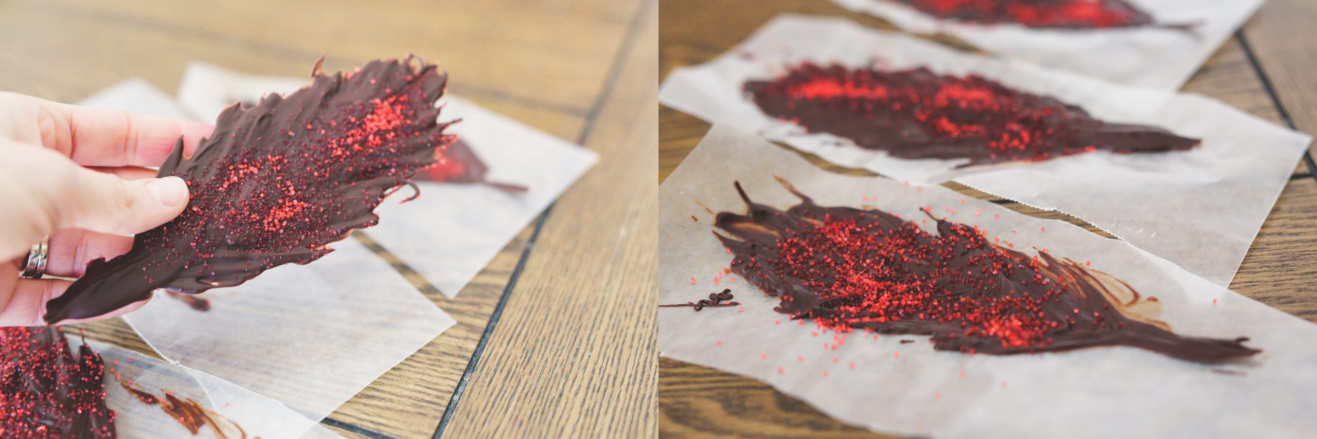 I trialed spraying the waxed paper with cooking spray, in an effort to prevent the chocolate from sticking. The cooking spray did not help and just made things messy! I should have known better, now I do for sure! Instead, non-coated waxed paper and paint out your feathers. Once your feathers are painted, let them sit for about 10-15 minutes. At this time, add in some red sanding sugar if you want a ‘red feather’ like the one at Storybook Treats.