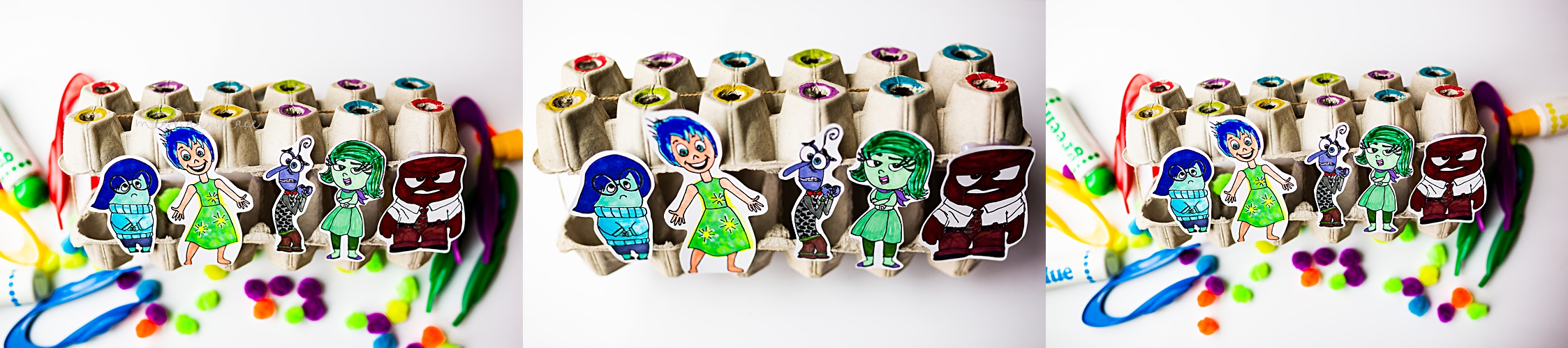 If you want to get a little fancy, you can remove the sides of your egg carton and connect the bottom and top pieces together with hot glue. Then, beyond that, you can get even fancier by adding the Inside Out characters to the front of the egg carton.