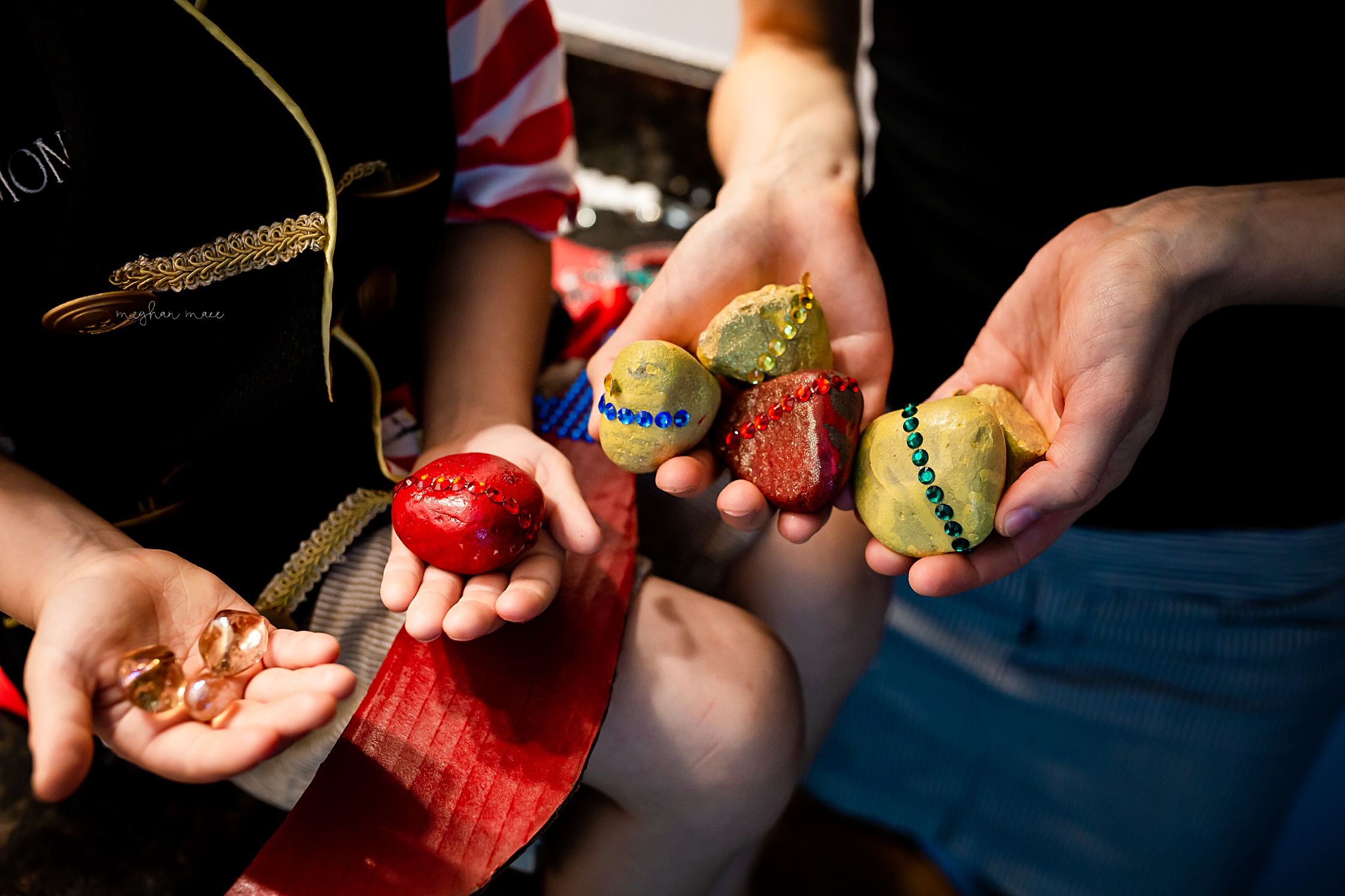 To create the gems we spray painted them red (to look like rubies) and yellow. Then after the initial color coats dried we added some glitter spray paint and some ‘gem’ stickers. The rocks were found outside in ‘nature’ and the ‘gem’ stickers were from the Dollar Tree. You can find similar ones here on Amazon.